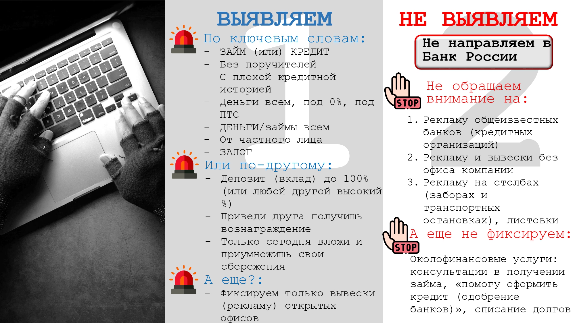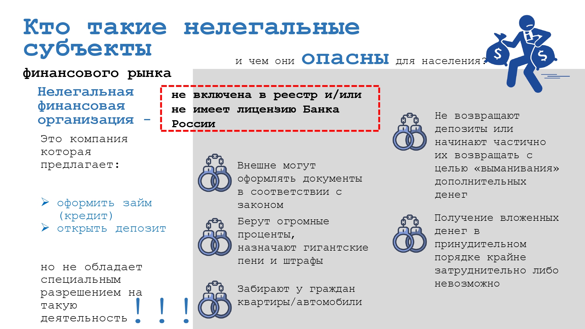 Деятельность нелегальных и (или) недобросовестных участников рынка наносит значительный ущерб для потребителей финансовых услуг, препятствует развитию и стабильному функционированию финансового рынка.